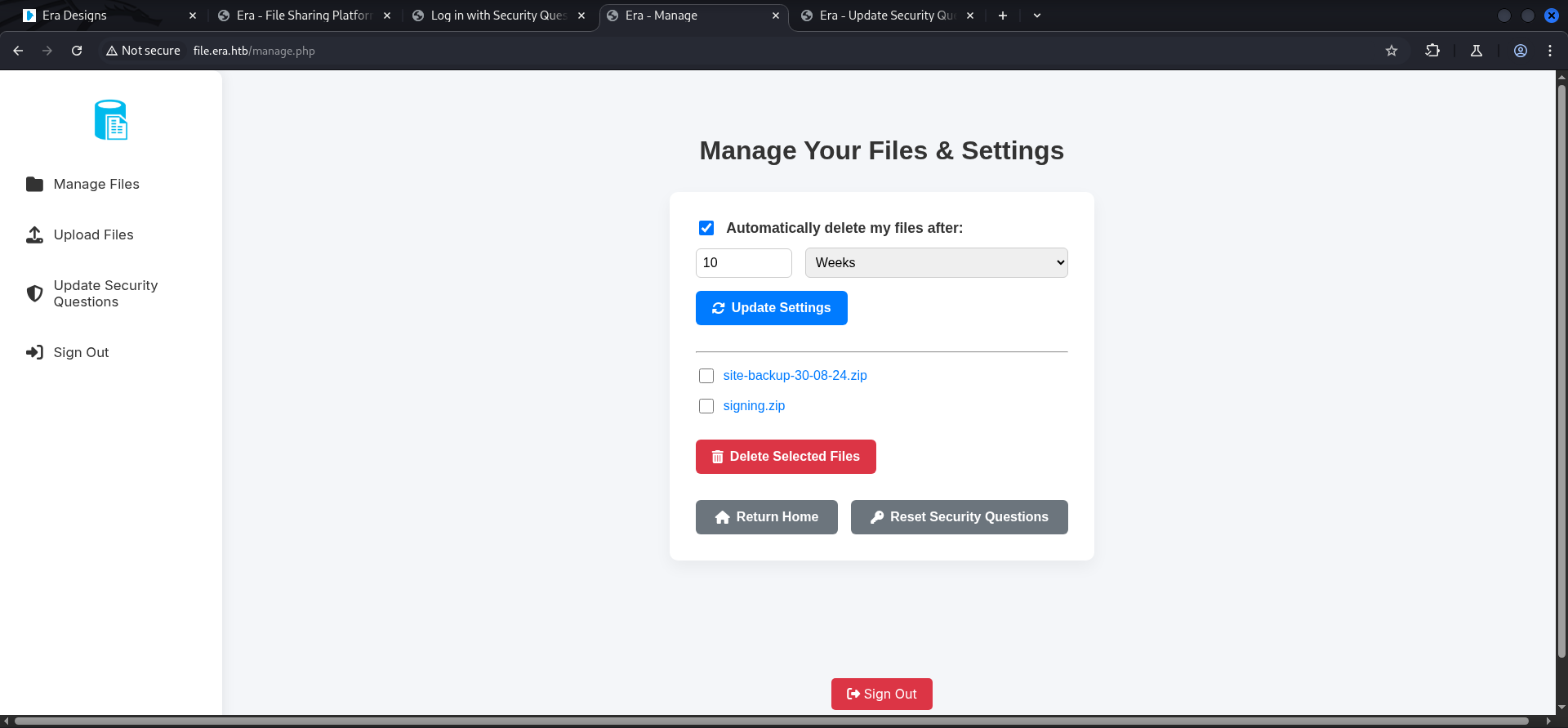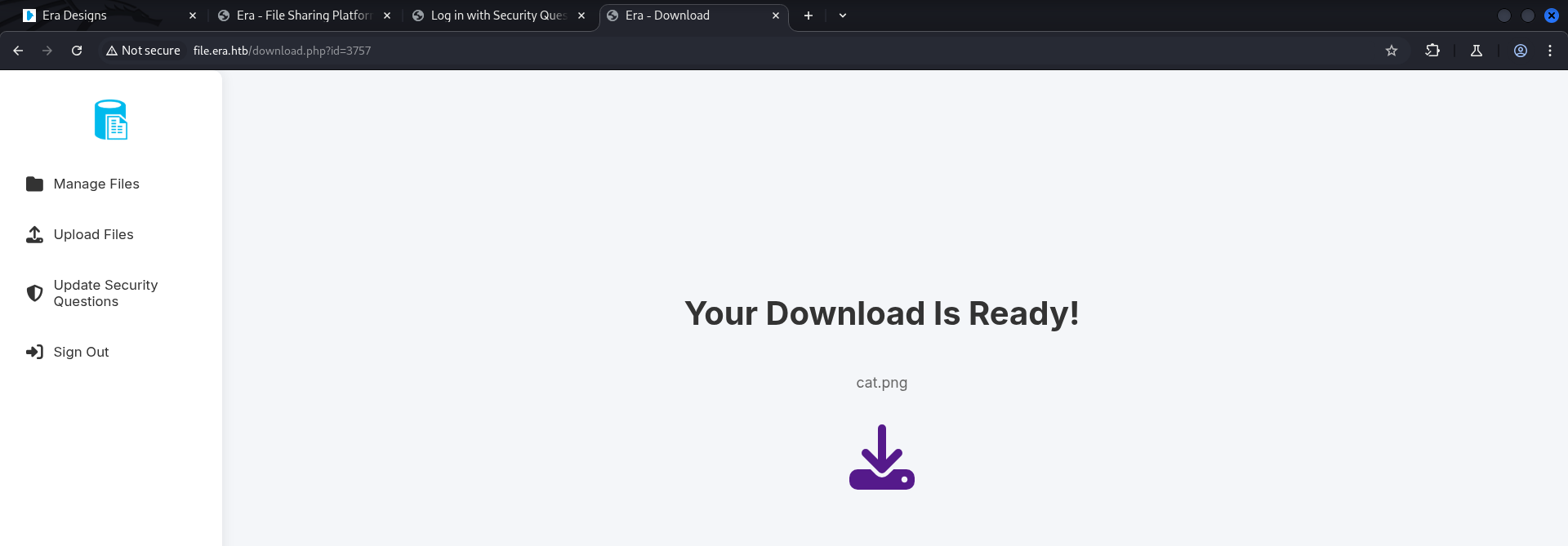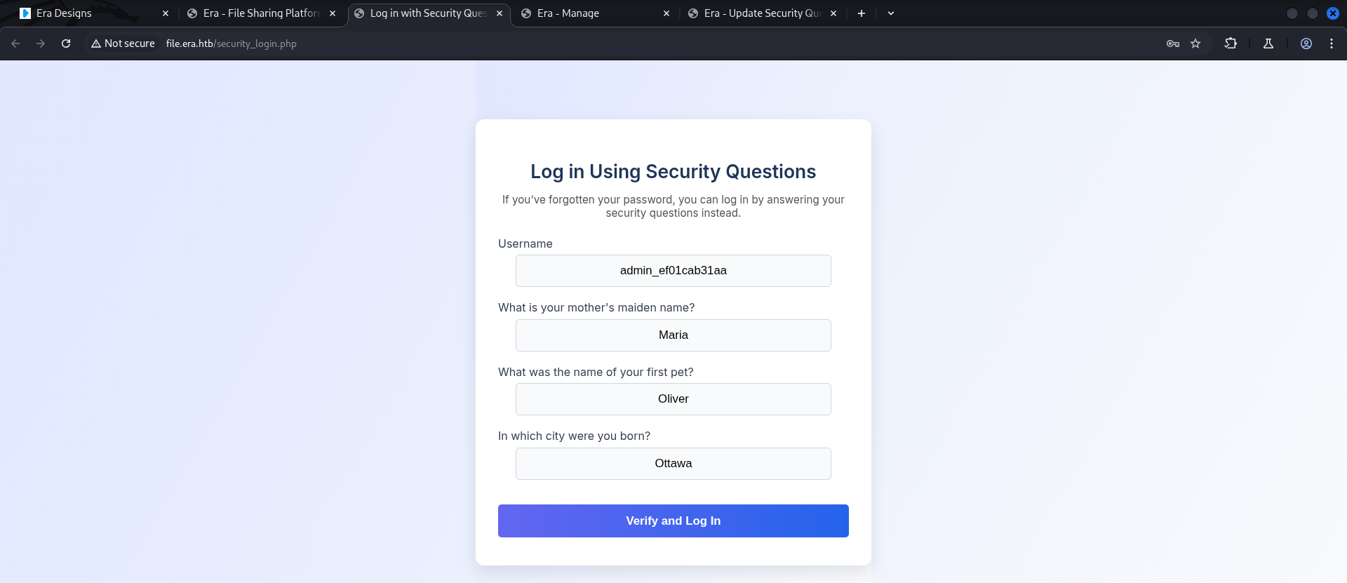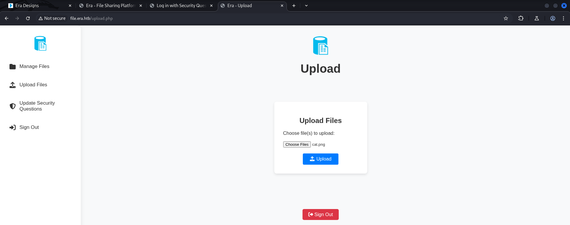 | Era | Linux | 10.10.11.79 | Medium | era.htb |